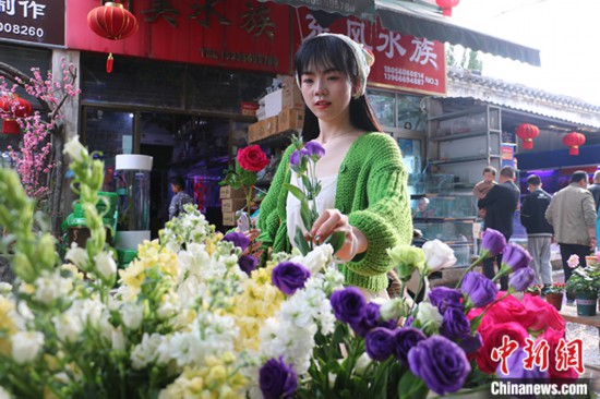 3月23日,安徽省合肥市裕丰花鸟鱼虫市场,“Z世代”女孩詹银银正在挑选鲜花,准备摆摊销售。随着气温回升,鲜花市场迎来一波热度。记者近日在采访中了解到,中国年轻人正在通过各种鲜花消费场景把春天“带回家”,鲜花消费已突破固有的节日专属仪式感,成为年轻人日常“悦己”的重要方式。 中新社记者 张强 摄